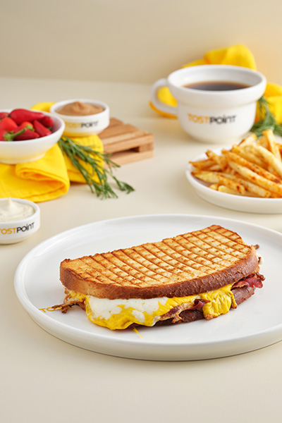 Özel Tost Ekmeği, Yumurta, Pastırma, Cheddar Peyniri, Mozzarella Peyniri.